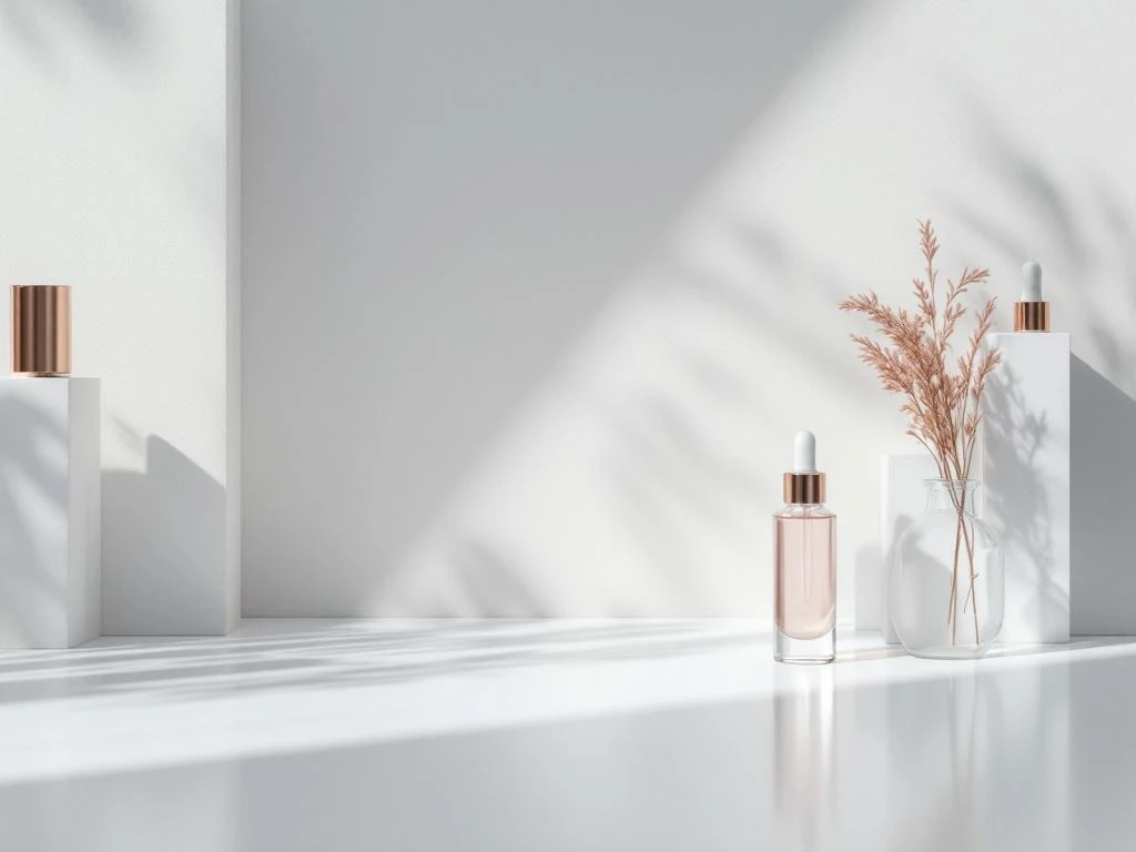 Minimalistische medizinische Ästhetik-Anordnung mit weißen Instrumenten und Glasfläschchen in symmetrischer Komposition
