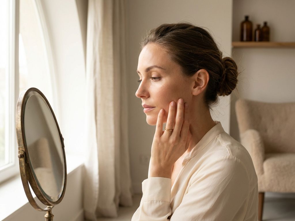 Frau betrachtet ihr Gesicht im Spiegel bei natürlichem Licht in minimalistischer Praxis für ästhetische Medizin