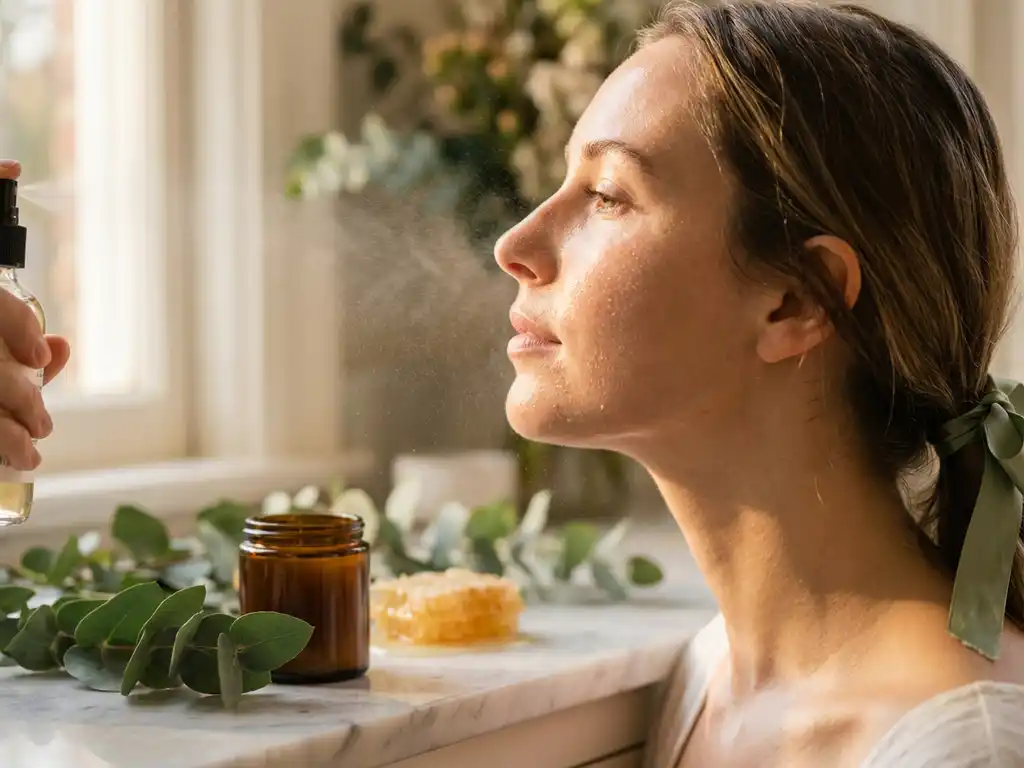 Frau im Profil mit strahlender Haut wird mit botanischem Gesichtsspray benetzt, umgeben von grünen Blättern auf Marmor