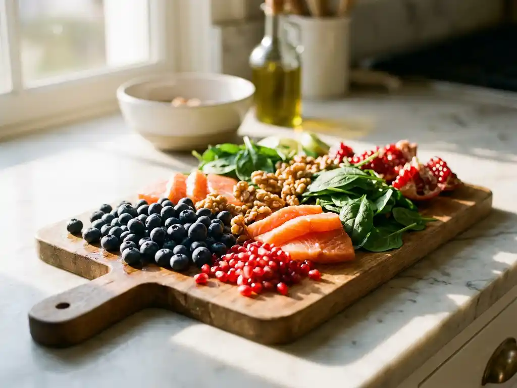 Integrieren Sie täglich eine Portion fetten Fisch wie Lachs, Makrele oder Sardinen für Omega-3-Fettsäuren. Alternativ können Sie Walnüsse, Chiasamen oder Leinsamen verwenden. Buntes Gemüse sollte die Hälfte Ihrer Mahlzeiten ausmachen: grünes Blattgemüse für Folsäure, orange Karotten für Beta-Carotin und rote Paprika für Vitamin C.