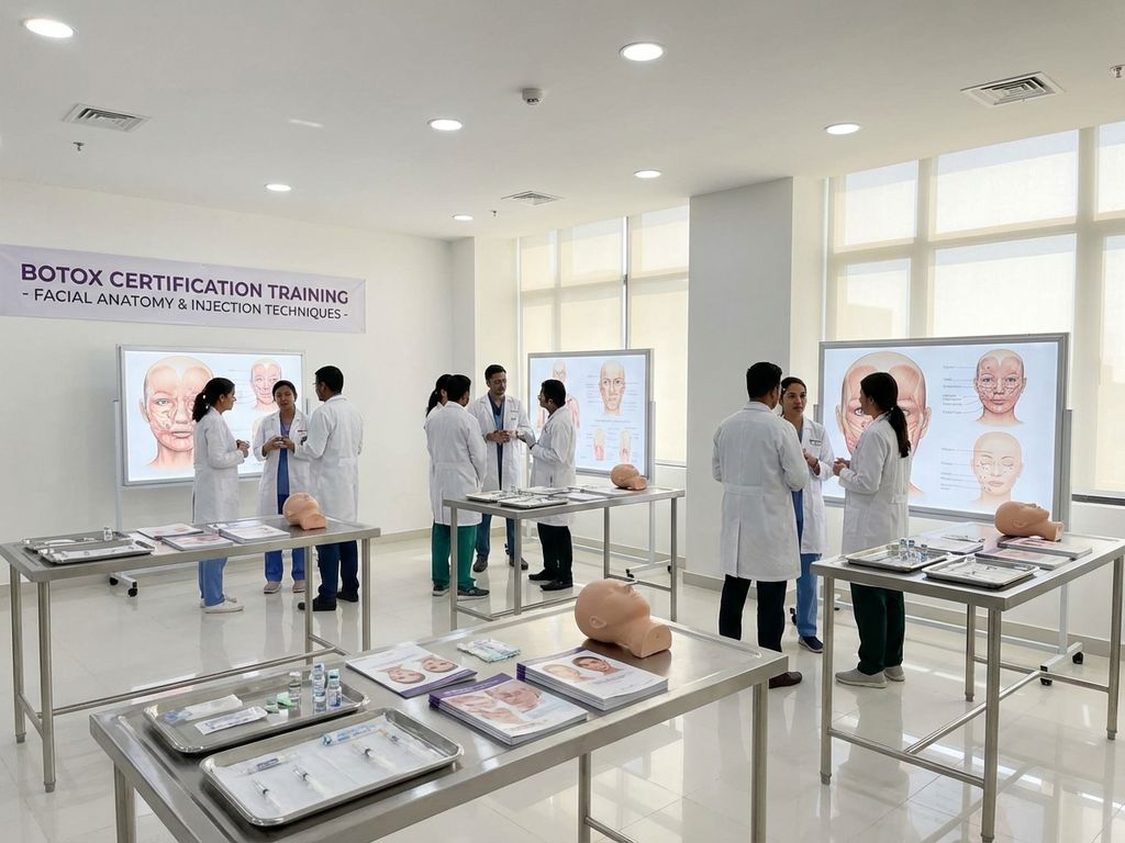 Medizinische Fachkräfte in weißen Kitteln bei Botox-Schulung mit Gesichtsanatomie-Diagrammen in modernem Klassenzimmer